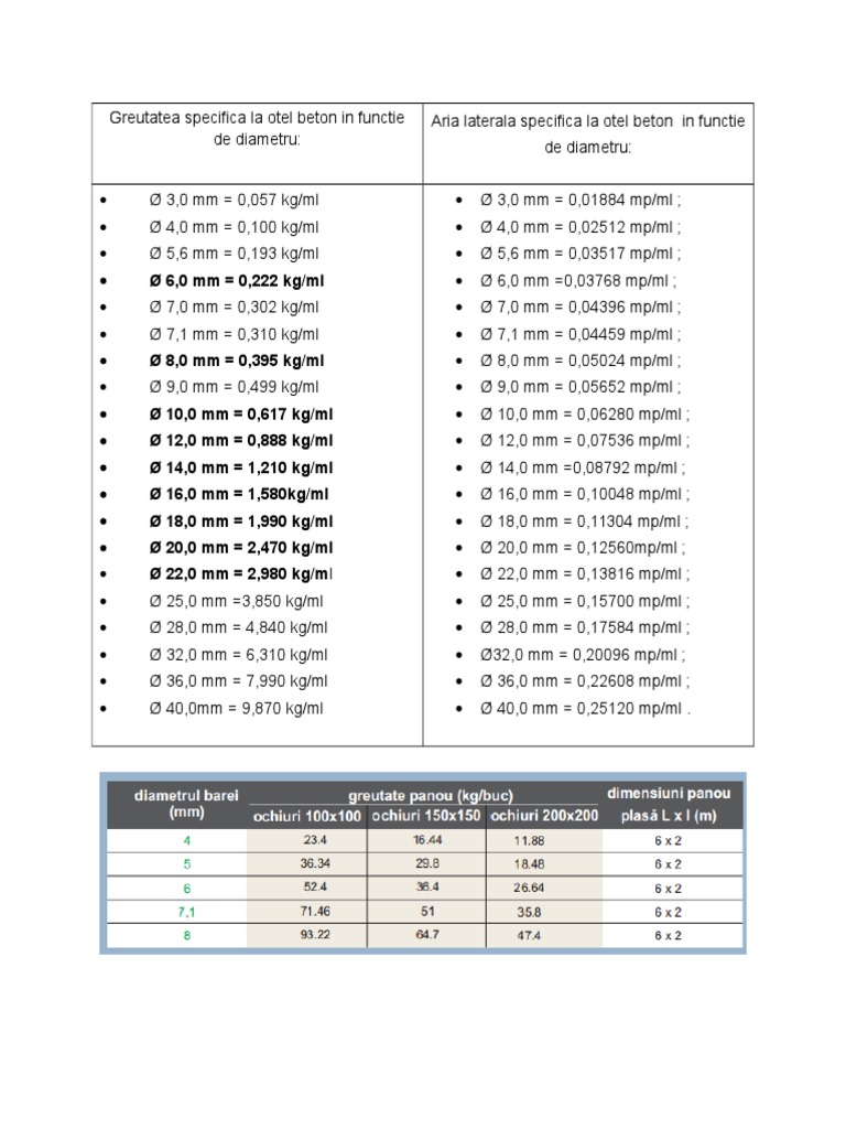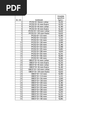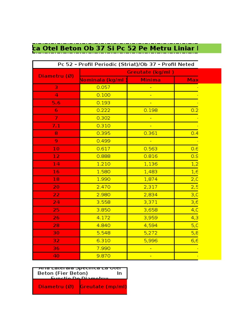 Greutate Specifica Otel Beton Ob 37 Si Pc 52 Pe Metru Liniar In Functie De Diametru Xlsx Pdf Free Download