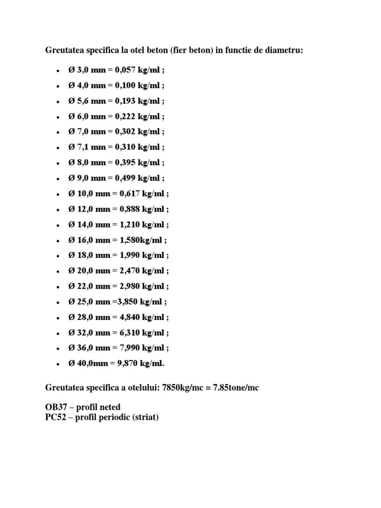 Greutate Specifica Otel Beton Ob37 Si Pc52 In Functie De Diametru Beton