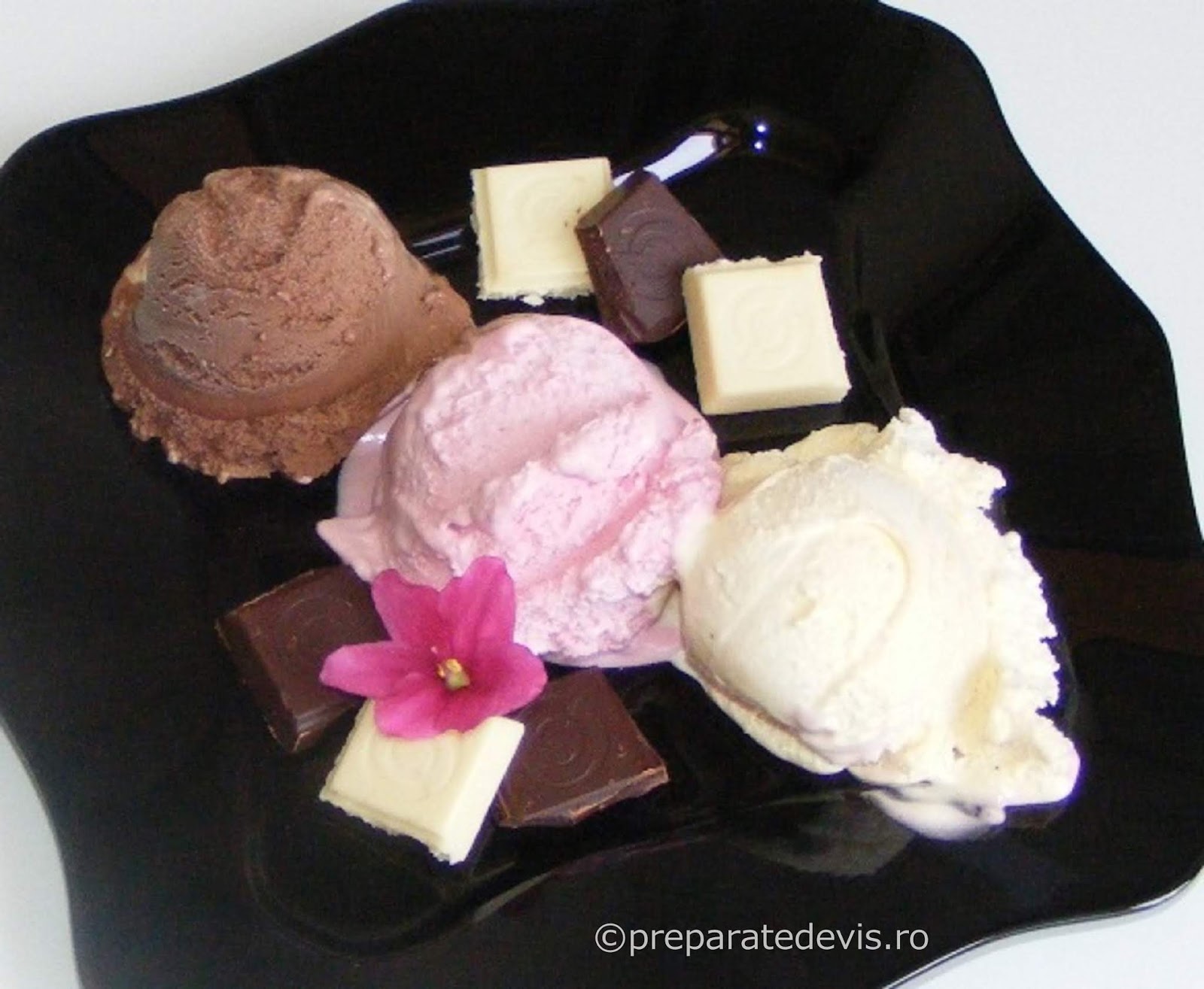 Se amesteca galbenusurile cu laptele praf zaharul apa si cacao. 1 litru lapte 350g zahar 8 oua o esenta oarecare cafea cacao vanilie ciocolata zahar ars etc 1 lingura amidon mod de preparare. Si chiar merita foarte simplu de preparat si nu se compara cu e urile si prafurile din comert. Pentru ca erau asa de bune eu am lăsat câteva bucăți de fructe in inghetata dar dacă nu iti plac asigura te că ai amestecat totul foarte bine până când vei.