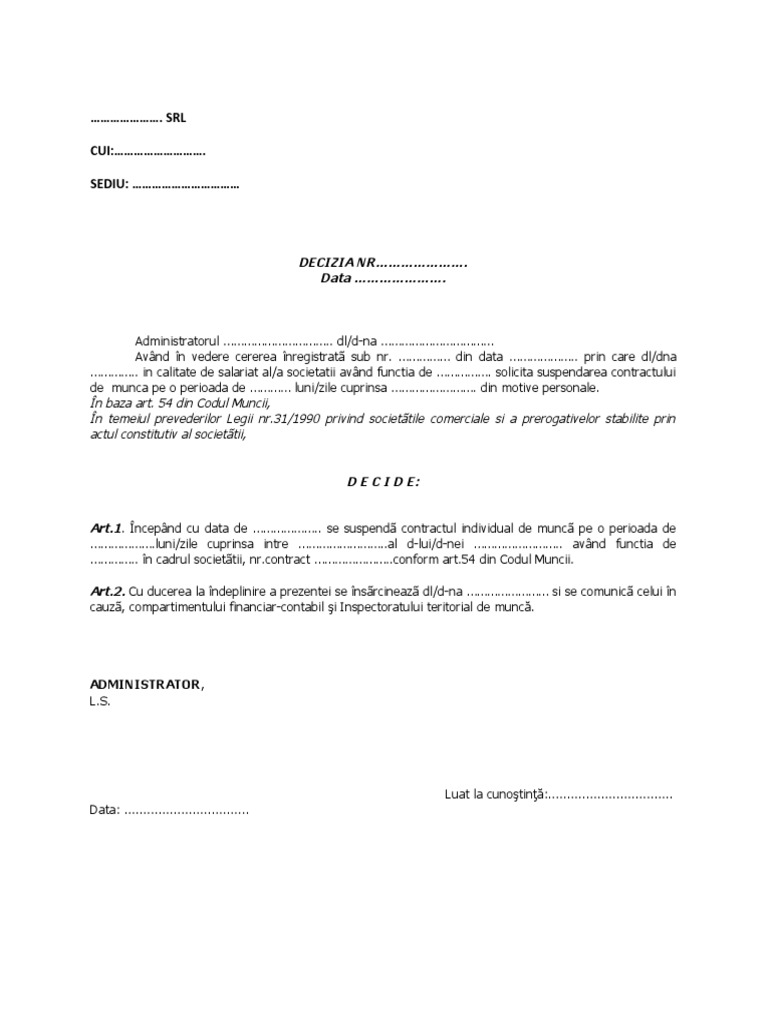 Model Decizie Incetare Suspendare Contract De Munca