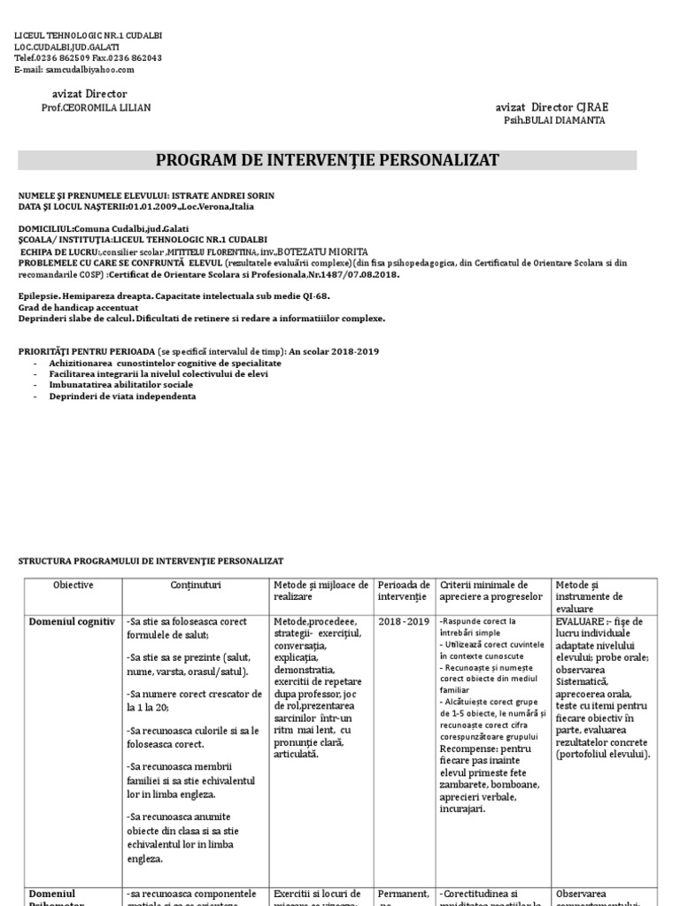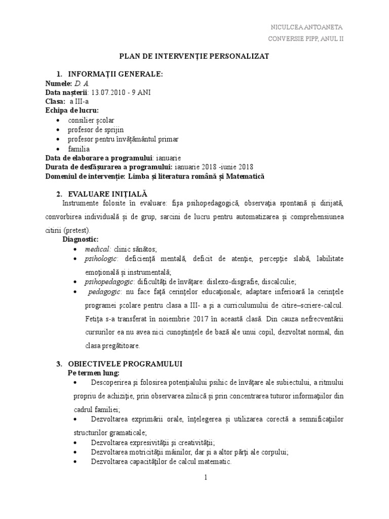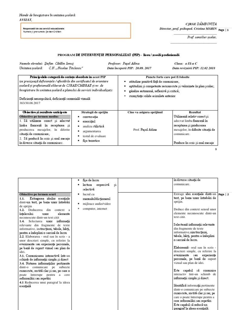 Doc Plan De Interventie Personalizat Pipoi Scoala Chiojdu Academia Edu